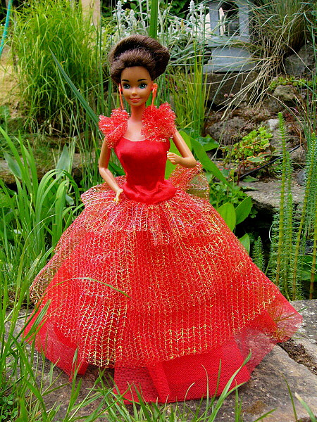 Tyto šaty NEJSOU MOJE DÍLO. Kdysi jsem je dostala na jedné blonďaté panence typu Barbie a vždycky se mi ze všech mých oblečků pro panenky líbily nejvíc. Jsou i kvalitně ušité, takže vydržely v podstatě v neporušeném stavu až do dnešních dnů. Jen jsem z nich už tenkrát ustřihla jakousi ozdobu, která se mi na nich moc nelíbila.