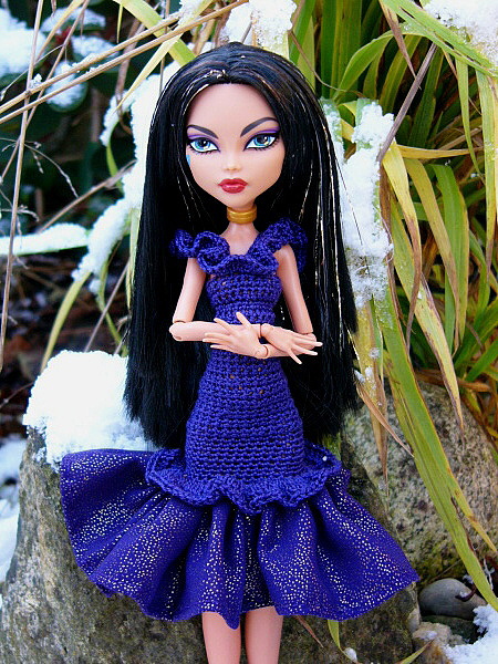 Představuji vám moji čtvrtou příšerku, dceru duchů, Spectru Vondergeist. Nevím, zda se to zdá jen mně, ale připadá mi, že má větší hlavu, než pyžamové příšerky, ale to na její kráse nic nemění. Jen je bohužel vyrobená v Indonésii, tudíž má tvrdou hlavu plnou lepidla a její stojánek je oproti těm od pyžámkových příšerek takový rozviklaný, rozpadající se. A také má asi tu nejhorší verzi kanekalonových vlasů, jsou hodně poletující a trochu se cuchají, s nádherným těžkým vlasem Cleo se to nedá srovnat.