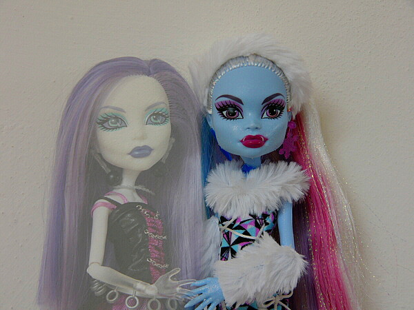Představuji vám novou příšerku z Monster High v mé sbírce, jde o Abbey, dceru Yetiů. Nějakou Abbey jsem měla v plánu už když se objevila první verze této panenky, líbí se mi její zimní vzhled a barvy vlasů. Myslela jsem, že teď na podzim u nás budou Dead Tired 2, kde se mi Abbey líbí také hodně, ale nestalo se tak. Přemýšlela jsem i o Abbey ze Skull Shores, ale tu také u nás nikde neměli. Když jsem před pár dny obešla všechna hračkářství a dívala se po prstenové Raquelle (kterou nikde neměli), v jednom z nich, kam moc lidí nechodí, byla ještě zmíněná první verze Abbey s deníkem, která nakonec u mě skončila. Připomíná mi to tvrzení Lenky (Nauriel), která jednou řekla, že pokud panenka k ní chce, tak se k ní vždycky dostane. Asi tomu také začnu věřit, protože v lednu, když jsem si koupila Spectru, dlouho jsem se rozhodovala, zda zrovna ji nebo Abbey. Vyhrála Spectra a už jsem s deníkovou Abbey od té doby ve sbírce nepočítala. A hle, je nakonec u mě.