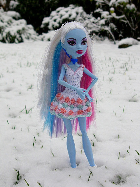 První sníh koncem října využila Abbey k předvedení svých nových šatů, které čekaly od léta, až se konečně jejich majitelka objeví ve sbírce. Jsou z jejích typických barev: bílé, modré, fialové a růžové. Růžová nemá ten správný chladný odstín, protože jsem vhodnou barvu tohoto materiálu neměla, ale snad to moc nevadí.
