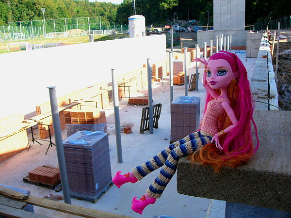 Podkladový beton pěkně vytuhl, a proto se v plnění plánu neotálí a už se poprvé začalo zdít z cihel, což vylákalo džina Gigi k prohlídce tohoto záhadného materiálu.